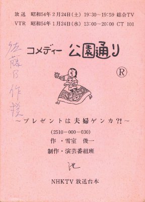 残念ながら見た記憶もなく、特撮でない実写コメディということで、これから先、放送やメディア化があまり期待できない作品ではないかと思います。 画像は、市場で手に入れた放送台本の表紙ですが、中身の注意書きは子役の「昌也」(押田昌也さん)のところに書き込まれており、「池」というのは押田さんのマネージャのようなので、これらの方が実際に使用したものと思われます。 「佐藤B作様」という書き込みがある意味は、よくわかりません。