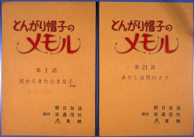 YAHOO!オークションで入手した『とんがり帽子のメモル』脚本29冊です。アフレコ台本ではなく、執筆された脚本をそのまま植字・製本したものと思われます。 放送と比べてみると脚本はほぼ忠実にアニメ化されているようですが、一部カットされたり追加されたりしているシーンもあり、制作の様子を知るよい手がかりになります。