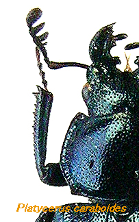 ヨーロッパ産のこの属も以前よりぼちぼちと集まり未展足の標本が溜まって来ていた。ある日や っと展足整理をしてみる気になり重い腰を上げたのだが、あらためてじっくり眺めるとヨーロッ パのルリは日本産とは又違った雰囲気を持っている結構良い虫ではないか!! 俄然興味が沸いて 来た。集まった標本にはきちっと同定ラベルの付いたものも有るが、中には同定されているもの の、どう見ても誤同定ではないかと思えるものもある。疑問が出ると興味は更に強くなり、そこ でこれらについて資料や情報を集めてみようと思い立った。 近年インターネットの普及で海外の研究者や採集者から直接標本や資料を手に入れる事も出来た り、素人にもなかなか便利な時代になったのだが、文献を捜すのは予想以上に時間が掛かってし まった。手に入っても当然ながらそれぞれの国の言語で書いたものが殆どで、言葉の壁も立ちは だかっている。 今回まだ十分ではないのだが現在まで調べる事の出来た資料から、知り得た事と幾つかの地域か ら来た標本の紹介として書いてみた。ほんの少しでもヨーロッパ産ルリクワガタの魅力を感じて もらえたら幸いである。 また期せずして今回のクワ馬鹿にはえいもん氏によるフランスでのヨーロッパコルリクワガタ採 集の記事が載り、非常に興味を持った。最近フィルドワークの乏しい (当然ヨーロッパで採集し た事は無いです) 自分としては、今後の期待が大である。 ルリクワガタの仲間は北半球の主な大陸と一部の大陸島に広く分布しているが、 ヨーロッパで見られる代表的な種としては、Platycerus caraboides (Linnaeus, 1758) カラボイデスとPlatycerus caprea (DeGeer, 1774) カプレアがよく知られて いる。この2種は非常に近い種で酷似しており分布が重なる地域も多く、今までしばしば混同さ れて来た事は否めないようで、この点を指摘する最近の文献も有る。 両種の形態からの区別は前胸背板と頭部のカタチとそれらに有る点刻の相違、更に脚や交尾器の 違いなどに及んでいるが、なにせ小さい種、頭部や前胸背板の点刻に関してはかなり拡大して見 る事が必要になる。ちなみにカプレアは若干点刻が少なくカラボイデスの方が密で、これは雄 雌とも同様である。 更に個体によっては微妙な違いでなかなか難しいものも有る。       ![]() 雄のサイズに関しては、カラボイデス8-13mm、カプレア10-15mm程度としてある文献が多く、 カプレアの方が平均的に大きいようだ。 幾つかの分布図(それぞれの国の)によるとこの2種は平地から標高1000mを超えた山地まで棲息し ていることが判るが、やはり小さい島には分布しないようだ。地中海に浮かぶかなり大きなコル シカ島、サルディニア島、シチリア島に於いても発見された記録が載る文献や標本をまだ知らな い。 ヨーロッパのルリクワガタは、ヨーロッパミヤマと同様に古くより多くの種名や亜種名が記載さ れその数は優に20を超えている。現在それらは同一の種に異なる種名(シノニム)がつけられたと して扱われるものが殆どのようだが、更に研究整理の進むことが望まれる。何しろ広範囲に分布 している系統だけに少し変わったのがいてもおかしくない。 今回、この2種のほかにイベリア半島からの種とコーカサス地方からは2種。そのほか中央ロシア 、シベリア、あたりまで含む地域のものを載せてみた。 Platycerus caraboides (Linnaeus, 1758) カラボイデス (ヨーロッパ) fig-6-16 Platycerus caprea (DeGeer, 1774) カプレア (ヨーロッパ) fig-5-7-14-15-17-18 Platycerus spinifer Schaufuss, 1862 スピニファー (イベリア 半島) fig-1-2 Platycerus caucasicus Parry, 1864 コーカシクス (コーカサス地方 ) fig-11-12-13 Platycerus primigenius Weise, 1960 プリミゲニウス (コーカサス 南西部) fig-8-9-10 Platycerus pseudocaprea Paulus, 1971 プセウドカプレア (ピレネー山脈) fig-3-4 ? Platycerus oregonensis Westwood, 1844 オレゴンエンシス ( 北アメリカ) ( 上記はここで扱った種の学名ですが以降、カタカナ読みした種小名か、その後にルリクワガタ をつけて表示しています。例-カプレアルリクワガタ ) |