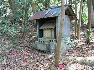 | 硬化層に似た地層があるところから右手に分岐する道は何処へ向かうのか探索してみることにしました。この道を進んでいくと、やがて向方ルート(沢沿いの道)に出ることがわかりました。分岐したこの道の途中に平場が連続してあり、一段上った平場の端には右の写真の神社祠があります。この付近の平場は地元の人がいう畑の跡なのかはわかりません。この祠は何をお祀りしているのか地元の人に聞いてみたところ知らない方が多く、ある人はお稲荷様だといわれましたが、正確には確認できませんでした。 | ![]() |