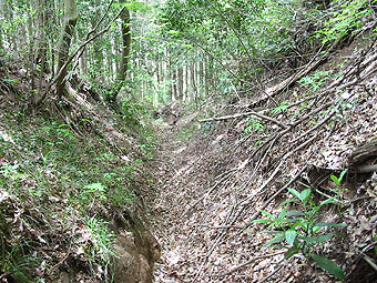道跡が分岐したところまで引き返し、尾根上の掘割道なりに直進すると、そこは麓へ下る急坂になっていました。掘割は深くV字状になり、また、かなり流出が激しいものと思われ、雨が降るとこの掘割道は川のようになるのではないかと想像されます。掘割底も人が一人、やっと通れるほどの狭さでっす。 |