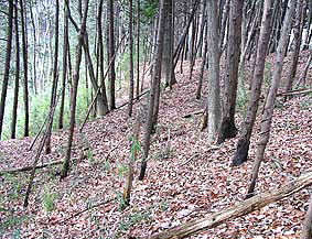 痩せ尾根状の峠道を更に北へ進みます。やがて道の東側にコンクリートのフェンスがしばらく続くところがあります。左の写真の辺りはフェンスがなければ切通し状の道ではないかと思われます。このフェンスの中がどうなっているかはわかりませんが、どうやら個人宅の土地のようです。 |