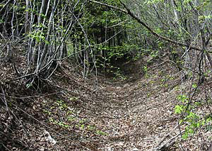 | 道跡が尾根に上がった辺りでは遠入川沿いの旧町道も尾根に上がってきています。右の写真は旧町道の脇に残る掘割道跡です。この写真の掘割は明らかに道跡と思われますが、今まで歩いてきた道跡に繋がるものではなさそうで、ルートの異なる別の道跡であるようにも思われます。 | ![]() |