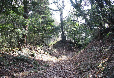 | 上の写真は坂を上りきって、出羽三山石塔のあるところの十字路を北から眺めるように撮影したものです。何とも不思議な光景です。どうやらここが峠であるようです。しかし、八王子ニュータウンができる以前の古い鎌倉街道の案内書などをみると、以前は峠に「名勝七国峠」と刻まれた石碑があったことが載っています。その石碑があった場所はこの写真のところだったのか、或いは別のところなのか私にはわかりませんでした。それにしても上の写真の不思議な光景は明らかに意図的に人手が加えられているように思えるし、この峠道が単なる支道ではないことを物語るように思えます。 | ||