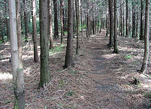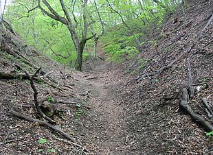 | 薄暗い杉林の古道を抜けると明るく広い尾根道が現れます。右の写真の付近の道は古そうな雰囲気が感じられます。この辺りはあるいは掘割状遺構なのかも知れません。この道があるところは尾根の一番高いところのようです。道跡の地形から見て、以前はそうとな交通量があったものと思われます。私が訪れた時は新緑の季節でしたが、秋の紅葉もまた素晴らしいのではないかと思われ、紅葉の季節にも歩いて見たいものだと感じました。 | ![]() |