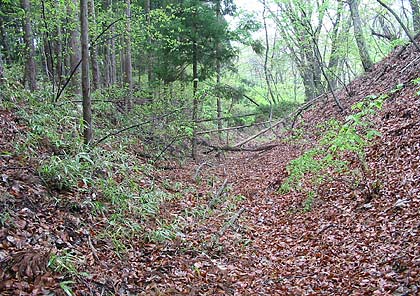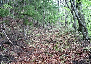 先ほどの崩れた土壁にお椀底形の地層を見たところの上から、掘割状遺構はこの先にもかなりの長さで残存しています。ところによっては2本の掘割地形が並行して確認できるところもあります。また幅が7〜8メートルちかくあるところも見られます。何度も申し上げるようですが、これだけの道跡がほとんど知られていないということが意外なくらいです。道跡など歴史的遺産として取り上げる価値がないものなのでしょうか。 |