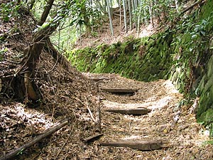 掘割の古道を下って行くと途中から上写真や左写真のような石垣が現れてきました。石垣自体は決して古いものでは無いようです。掘割道の上部はゴミが散乱して廃道に近い状態でしたが、だんだん下るにつれ、実用的な感じの道へと徐々に変化してきています。しかし、この写真の辺りでも古道の雰囲気は十分過ぎるくらいあります。 |