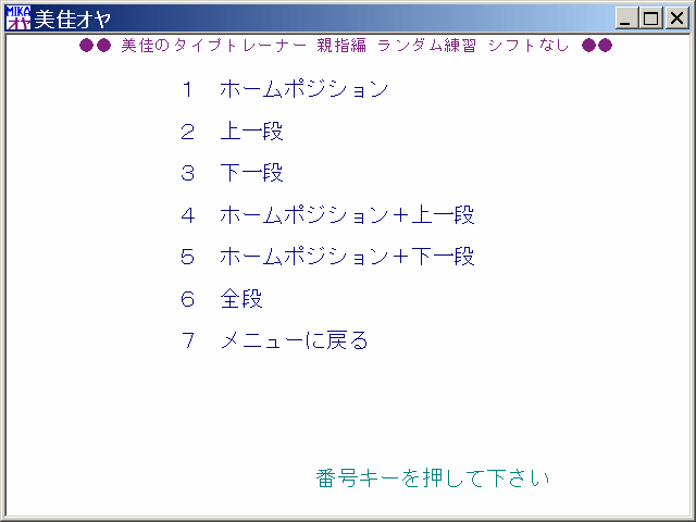 美佳のタイプトレーナ親指編ランダム練習メニュー画面