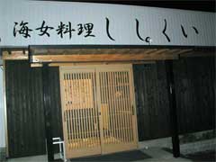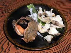 | 「ししくい」という店に行った。メニューは3つだけ。ボクらは一番安い5000円のコースを頼んだ。焼き物以外にあわびの刺身や貝の煮物などもあった。お店の人(海女さん?)が目の前で焼いてくれる。 |