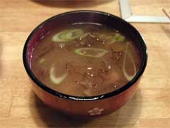 | マツカワでとった出しの味噌汁。中に、マツカワの切り身、フノリが入っていた。 |