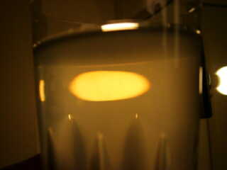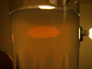 キッチンにあるもので,コップの中に,赤い夕日を作ります。