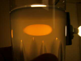 この実験では,青い光を散乱させる原因を,水と牛乳で作ってみました。牛乳は「水溶液」ではなく,脂肪などの成分が,ごく細かい粒子になって水中を浮遊している「コロイド溶液」です。コロイドの粒子を,大気中に浮遊するチリなどのモデルとして利用してみました。