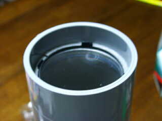対物セルのほうは,VU50の水道管を2本繋げるためのジョイントを使います。このパーツは,真ん中に内径50mmのリングがあって,両側からVU50の管をはめこむものです。このリングの上にレンズをぴったり乗っけるようなセルを作ります。ジョイントの内径は56mmぐらい。対物レンズの直径52mmとの間の差は,肉厚1mmの「ライト塩ビ管」の小さな輪切りに切れ目を入れて押し込んで,2mmの差を埋め,さらにその内側に植毛シートを貼って摩擦力をつけ,レンズをぐりぐり押し込みます。念のため,筒先にレンズ脱落防止用のリングをはめます。光軸調整機構は省略します。もともと水道管のジョイントなので,鏡筒にセルをぐりぐり押し込んで使うのですが,押し込み加減で光軸を出すことにします。