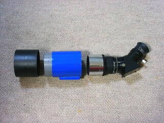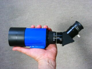 分解図。塩ビ管で作った鏡筒で,対物部と接眼ユニット(50.8→36.4mmスリーブアダプター,直進ヘリコイドS,正立プリズム,アイピース)を繋いでいるだけです。鏡筒にはカメラ三脚に取り付けられるよう,1/4Wのネジがついています。各パーツは,全部はめ込み式。クローズアップレンズの焦点距離や接眼部のプリズムの有無などに応じて,いろんな長さの鏡筒を塩ビ細工で作り,とっかえひっかえ,遊ぶ!遊ぶ!!