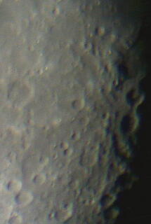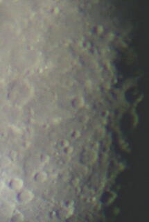 撮影方法は,前回同様,コリメート法,つまり,望遠鏡をカメラで覗いてシャッターを切る,と言う方式。前回は,カメラも望遠鏡も三脚に載せて,光軸合わせに手間取りました。そこで今回は,大胆にもカメラは手持ち!その代わり,速めのシャッター速度(1/15〜1/30秒)で撮影し,やや光量不足な点は,画像処理でカバーすることにしました。しっかりと三脚に据えた望遠鏡で月を捕らえ,デジカメのレンズを押し当ててシャッターを切ります。カメラのフォーカスはマニュアルで無限大にセットし,絞り開放,シャッター速度もマニュアルで調整。ピント合わせは望遠鏡のほうで行います。あとはバシャバシャ撮影して,条件の良いコマを選んで,画像処理します。
