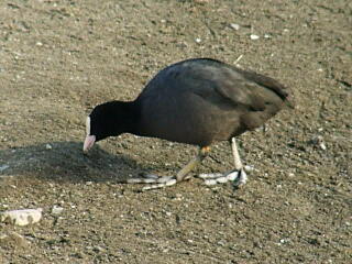 オオバンがカモでない証拠がこれ。大きな脚,指の周りに申し訳程度についている「ひれ」。どう見てもカモじゃないでしょ(オオバンはクイナの仲間です)。