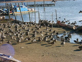 親水広場では,水辺に行くと,いきなりカモの歓迎を受けます。このエリアでは餌をまく人が多く,カモ類,特にオナガガモが餌付けされています。餌をくれそうな人が来ると,こうやって陸に上がって催促します。……う〜ん……人なつっこいのは確かに,来訪者から喜ばれるけど,こうして餌付けされるのって,オナガガモとかユリカモメがほとんど。実は,他の鳥たちは追い出されてしまったんです。これを見て「鳥が増えた」と喜ぶのは早計です。「人と鳥のふれあい」と言う意味では成功なんでしょうけど,自然保護的には,あまり良くない状態でもあるわけで,どちらのメリット,デメリットも考えると,ちょっとばかり悩ましき餌付けなのです。
