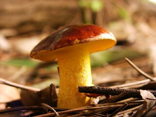 | アカジコウ。イグチ科のきのこは,かさの裏の胞子を出す部分が,網目状になっているので, 初心者でも「イグチ科」であることはすぐにわかるのだが…。 |