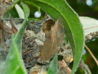 ツバキの葉のかげに,ムラサキシジミ。
