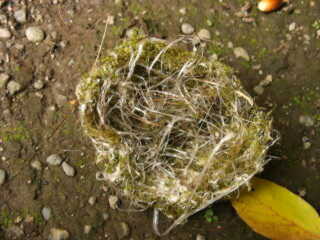 拾い物2題。メジロの巣が落ちていました。産座には苔を敷いてありますが,巣材にはシュロやビニール紐が使われていました。トラツグミの羽がまとまって落ちていました。身は無し。状況から見て,猛禽に食べられた痕でしょう。これを見つけたおかげで,明治神宮にトラツグミが来ていたことが分かったと言うわけ(トラツグミは夜行性なので,探鳥会ではなかなか見つかりません)。