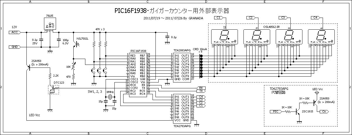 今回は同一ケース内にある PIC 同士の通信なので RX, TX 同士をクロス直結している。ガイガーカウンター本体と表示器との間がだいぶ離れてしまうようならちゃんとレベル変換