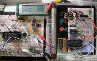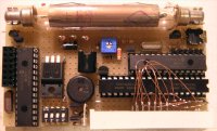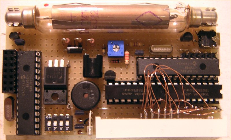 | 基板表 左半分がガイガーカウンター、 右半分が外付け表示器。 運用時は LCD は取り外す。 (写真は開発途中の 16F886 版) |