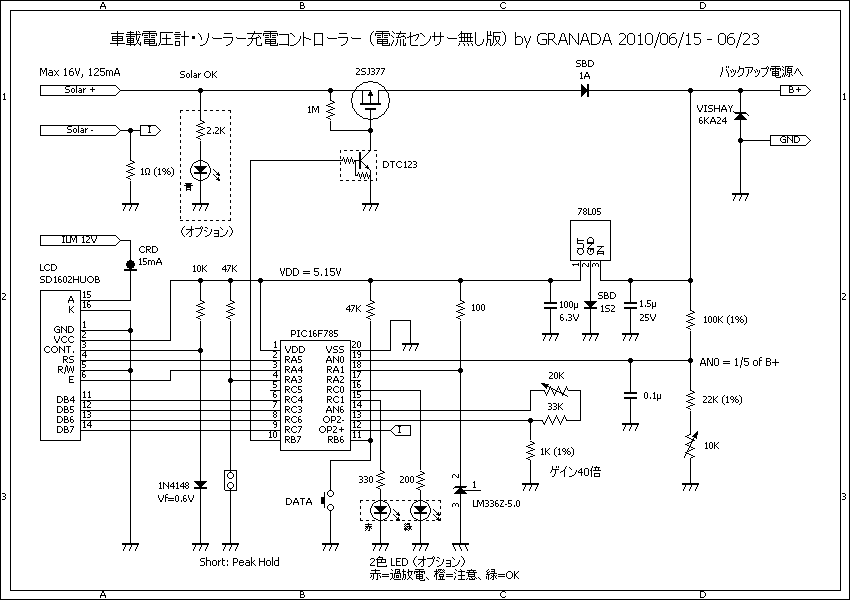 が。ただの電圧計なら機能豊富で安価な市販品が多数出回っているし、先人達による車載電圧計の製作例は極めて豊富。ありきたりなものを作っても面白みが無い。そこでひとヒネリして太陽電池で補充電できるよう、充電コントローラー機能も持たせてみた。