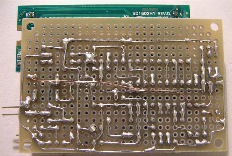 | 製作途中の表面。LCD は最後に 中央のピンに直接ハンダ付けする。 基板中央の筒状の部品 (6KA24) は 24V カットのサージアブソーバー |