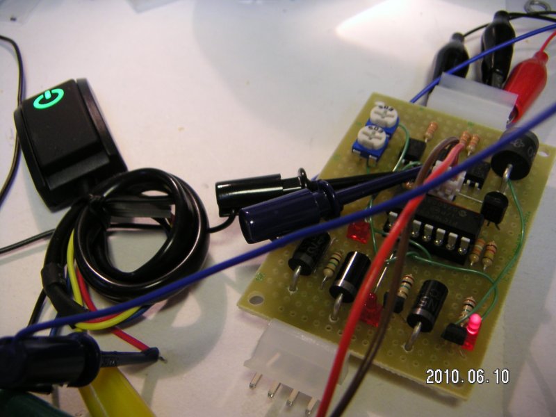 の場合、ベース抵抗は 2.2K なので、Vf = 2V 程度の赤 LED でも動作時 1mA 程度しか電流が流れないので超高輝度品を使うべし。もっとも最終的にはヒューズボックスの辺りに押し込むことになろうから、動作確認不要なら