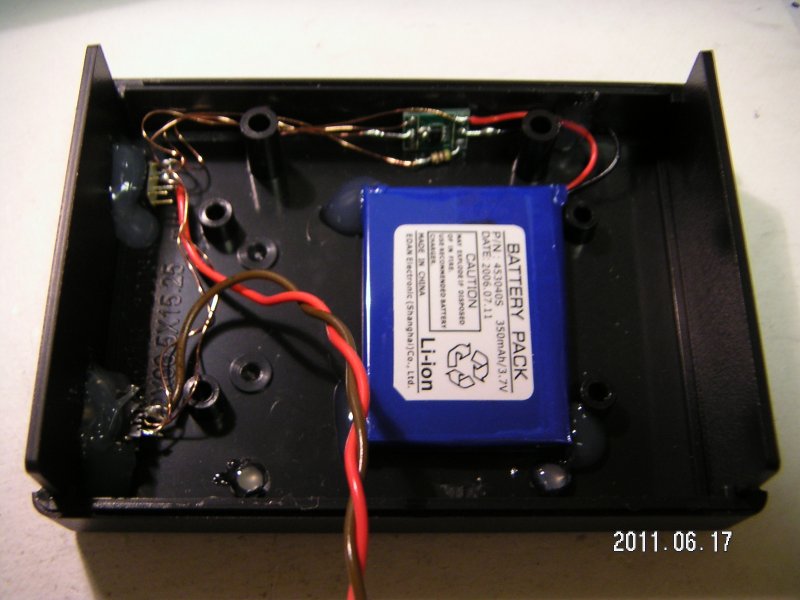 | 電源は 350mA/h のリチウムイオン電池。 専用 IC で充電も簡単。 固定はお手軽なホットボンドで(汗) |