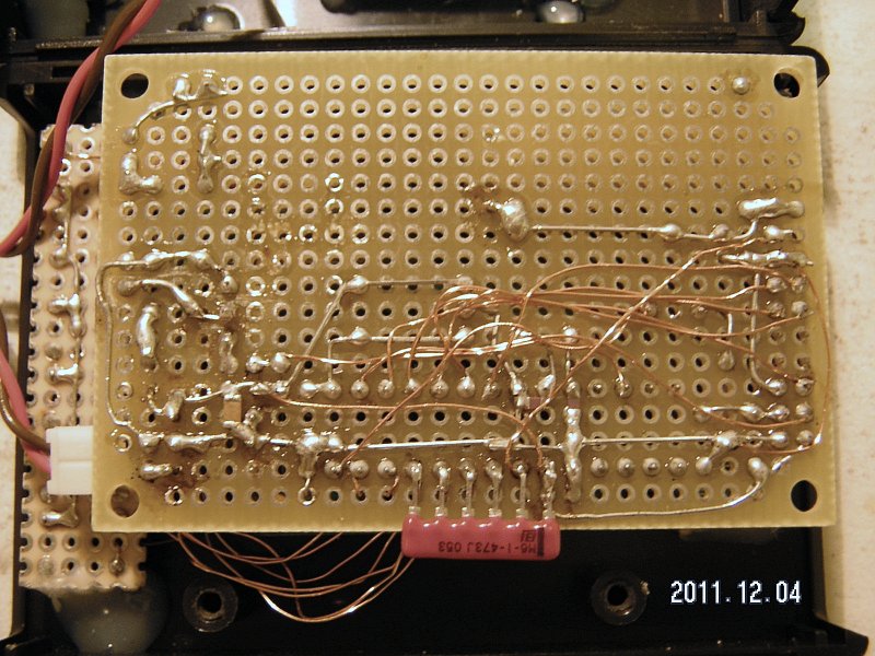 組み上げ直後の状態。 パルス検出部がインダクタに近すぎ、 スイッチングノイズを拾いまくって 誤カウントが多発(爆) |