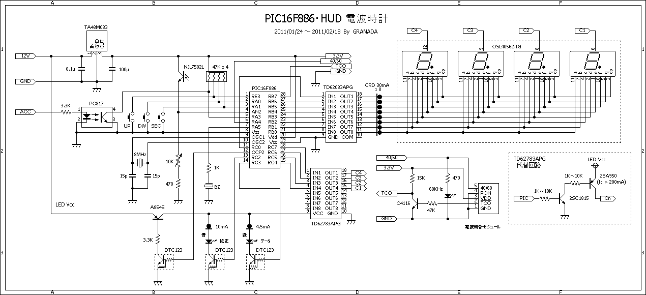 今回のモジュールは TCO が負論理のためトランジスタで論理反転して PIC に入力する。(最初オシロで波形を見たときは負論理であることにしばらく気付かなかった。我ながら修行が足りマセン・・・