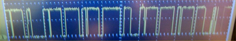 で、通常 PIC でパルス幅を計るとなるとキャプチャ機能を使うのが最も一般的だろう。まぁ、確かにそれでも動く。規格通りの綺麗な信号だけが送られてくるならば。実際、茨城の管理人宅は室内でも受信状態は極めて良好で、写真のような非常に綺麗な信号が受信できる。実際にキャプチャでパルスを判断するプログラムを組んで確かめたところ、電波状況が良い場所ならこの方法でも時刻をデコードできることは確認できた(まぁ、当たり前のハナシだ)。