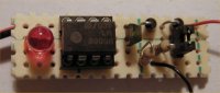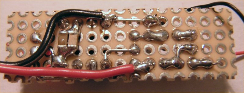 部品点数が少ないので基板のきれっ端で回路を組み上げ、秋葉原の千石電商で売っていた蓋が透明なケースに入れてみた。今回使用したアモルファス太陽電池はガラス基板(?)上に成型されているため取り扱いに注意が必要だが、このケースなら太陽電池をケース内に収納できる。ただ