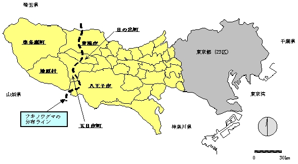 東京でクマが生活する市町村には,奥多摩町,檜原村,青梅市,日の出町,あきる野市(図中は古い表記の五日市町となっています),八王子市が含まれます.一般には奥多摩山地と呼ばれる地域です.またクマの分布で濃淡の高い地域は,奥多摩湖の周辺から雲取山にかけての山域と考えられています.ただしクマたちは都県境を自由に行き来していますので,生活域は山梨県や埼玉県とも連続しています.クマの分布域の最前線は,新宿から直線距離で40kmほど西の地点です.またクマの分布域には,たくさんの人たちも昔から生活しています.