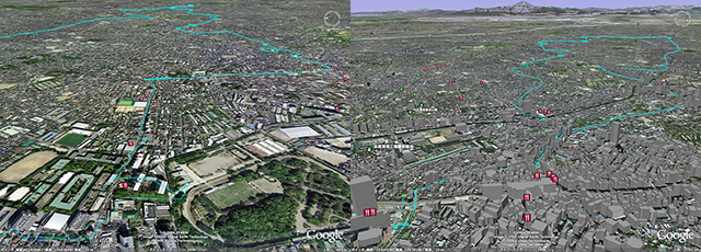 GPSデータをWindowsマシンで吸い上げ(わたしのGPSはMac非対応なので……)、そのGPSデータをGoogleEarthにはりつけて遊ぶ。これは楽しいっ。