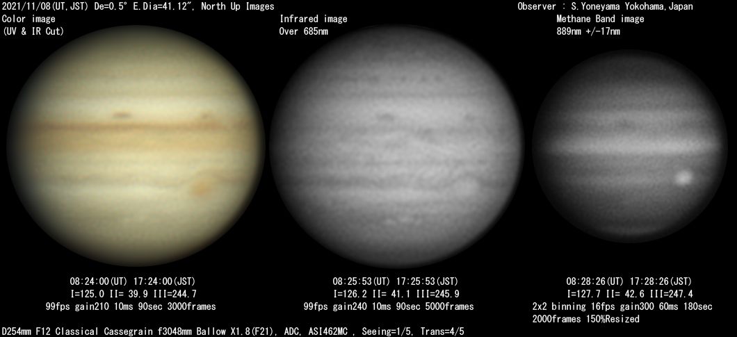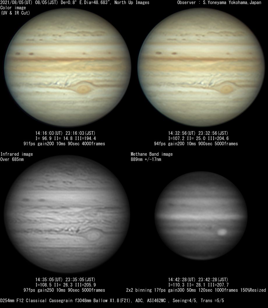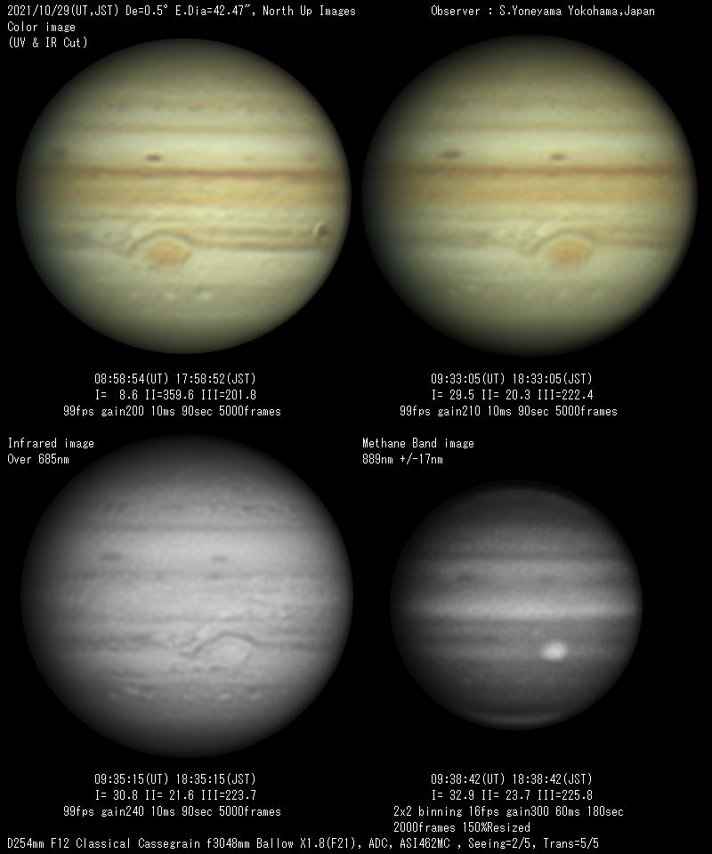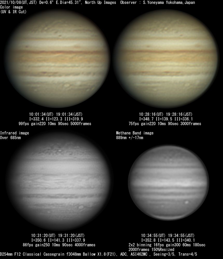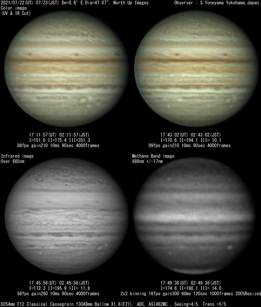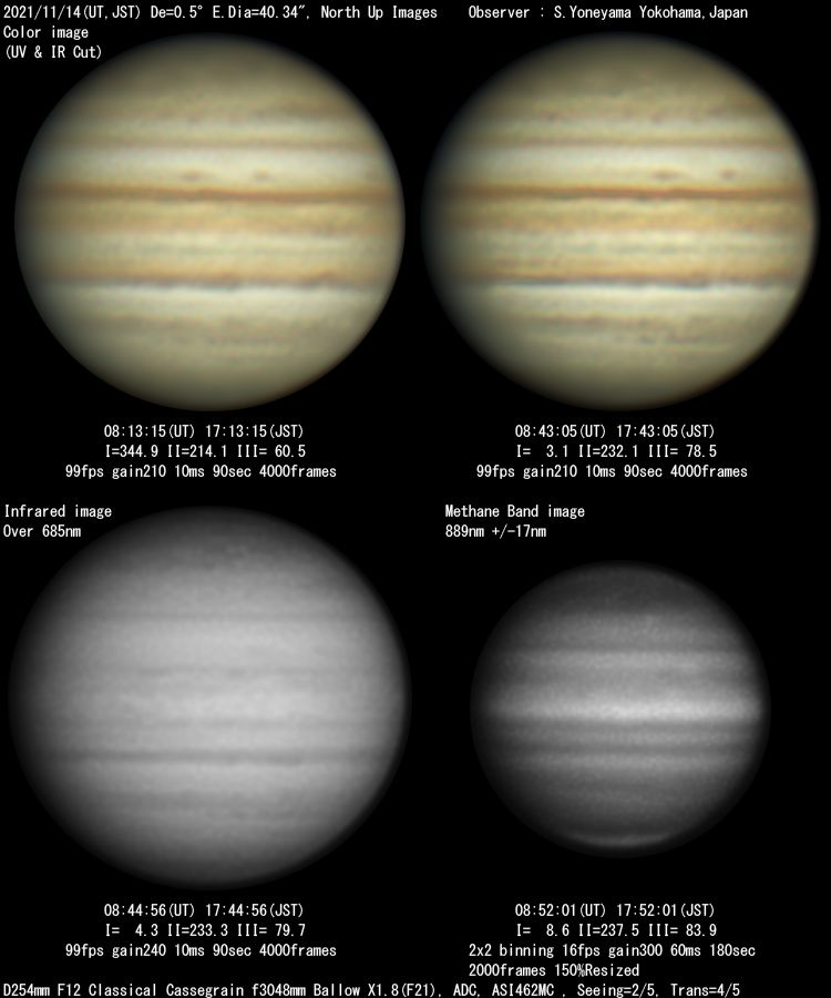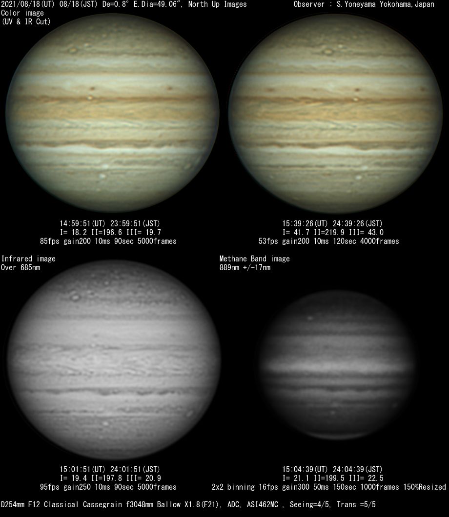 | フィルター | ・可視光用 UV&IR Cut(紫外線&赤外線カット)フィルター ・IR Filter(赤外透過フィルター): バーダーIRパスFilter Over685nm、ASTRONOMIK Pro-Planet Over807nm ・メタンバンドフィルタ :IDAS Methane 890nm 半値幅17nm ・大気分散補正器具 :ZWO ADC(ウェッジプリズムを2枚組合わせた、角度可変タイプ) |