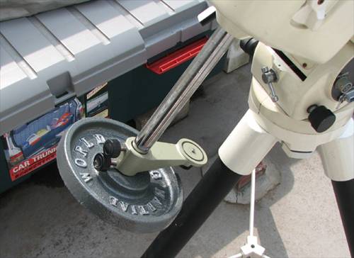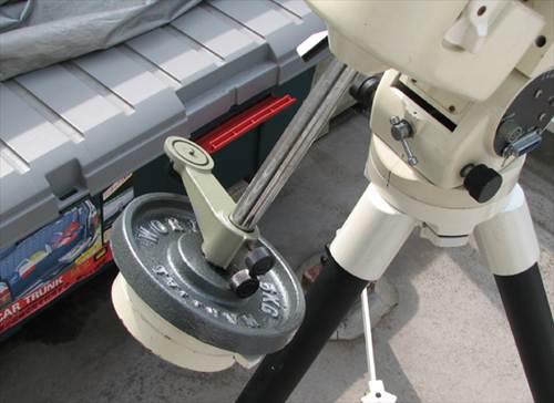 | もう一つの工夫は、バランスウェートを 3.7kg+5kgにした事です。 このウエイトでも MC90Lとスライドプレートを付けて、一眼レフ デジカメを取り付けると 3.7kg+3.7kg+1.9kgが必要になり、 3.7kgを追加購入する必要がありました。 しかし、この5kgのウェイトなら、重心が下がりモーメントの関係で 3.7kg+1.9kgとほぼ同じバランスになり、ウェイト重量を600g軽減 できるので、赤道儀への負担を軽減できます。 それで、3.7kgの代わりに5kgを購入しました。 |