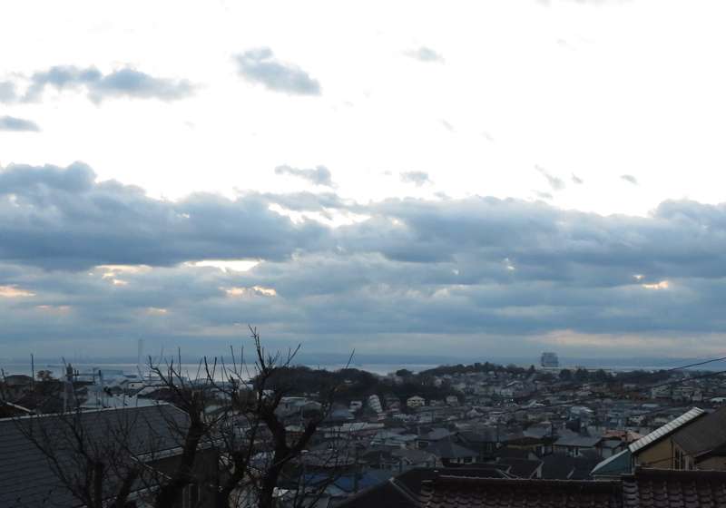 今年の初日もいつもの休日通りに夜明前の早朝散歩でした。その後、雲があったけどダメ元で初日の出を見るために向かいの丘に登りました。でも予想通り房総半島の上には厚めの雲があり、初日の出は拝めませんでした。日の出時刻5分後の空の画像です。富士山も薄雲がかかっており、はっきりとは見えませんでした。