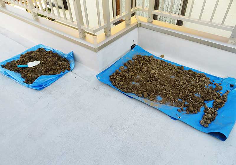 掘った土はセメントを捏ねるトロ舟に入れてシートを掛けて置いたけど、いつの間にか雨水が沁み込みドロドロになっていました。それをシート2枚に広げ乾かし始めました。先日の降雪時は上にシートを掛けて置きましたが、陽が射さない庭で乾きが悪いので、小分けにして屋上に敷いたシートの上に移しました。陽射しがあれば乾くのは早いでしょう。