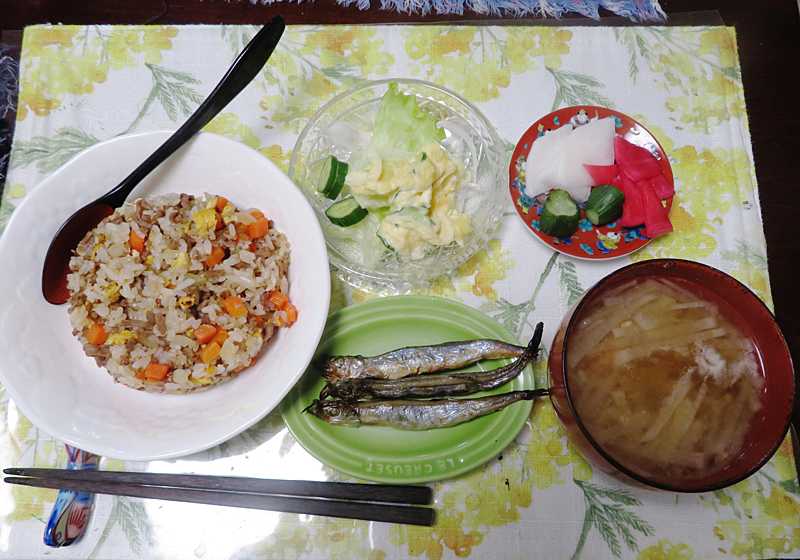 今日の画像は、私の手作りのチャーハンです。ご飯が余っていたので、今日の昼食にチャーハンを造りました。いつもと同じ出来栄えでした。当然、チャーハン以外は全て妻が準備です。
