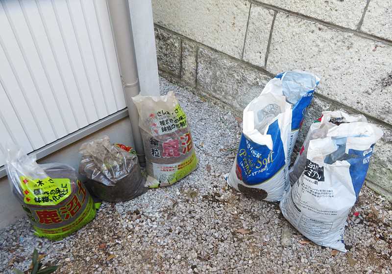 細かな土は3袋、砂利・岩・硬く大きな塊となっていた土が4袋です。細かな土は車で15分ほどの園芸店で引き取ってくれるので来週の週末に持って行く積りです。残りの4袋分は、コンビニの小袋に入れて週2回の一般ごみ収集日に出して持って行ってもらう予定です。