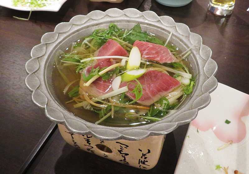今日の画像は、その新年会となったホテルの夕食の料理の一つ、ねぎま鍋です。ねぎま鍋の事はTVの時代劇などでよく聞きますが、食べたのは初めてでした。出汁にネギと野菜とマグロの切り身だけの素朴な料理ですが、美味しくトリコになりそうです。
