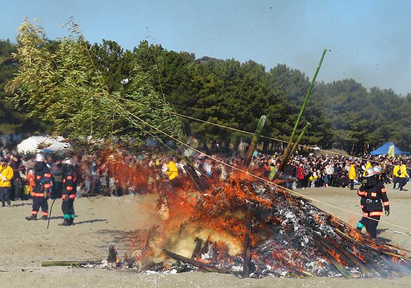 今日の画像は、そのドンド焼きです。今日は海から吹く南西の風が強く、お焚き上げの火が上に上がらず横に伸びた為、下の方だけがアッとゆう間に燃えてしまいました。