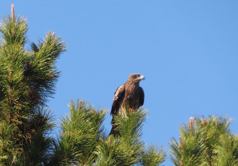 今日の画像はトビです。先週の土曜日に行われたドンド焼きに行った時、会場の海の公園にある松林の樹の上に止まっている時に撮影しました。ドンド焼きを見に来た人々が食べている物を狙い、鋭い目付きで獲物を物色していました。小鳥とは違い、猛禽類の険しい顔つきです。