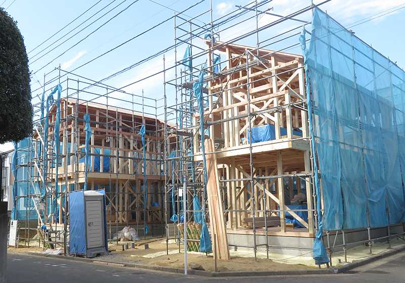 現在も我が家から500m内で数軒が建設中です。画像はその中の1区画で2軒が建設中。建物は同じ程度のサイズですが、土地の面積は左右で4対6と異なっています。我が家も同じ感じの1区画を2分割した建売でした。土地は我が家の方が狭かったので、何とか買えました。