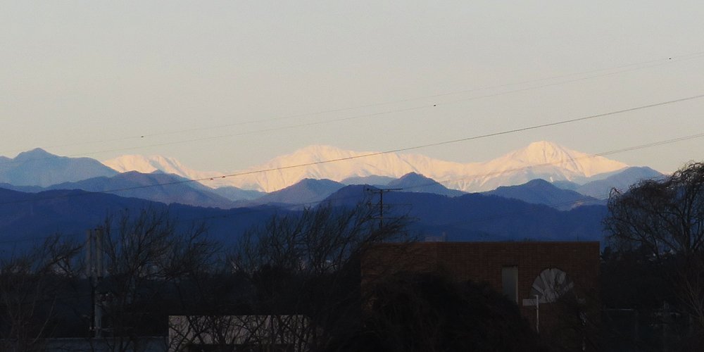 今日の画像は、白峰三山です。今朝は雲が広がっており富士山は雲に隠されていたけど、北西方向の低空は雲が無く、白峰三山が朝日を受けて真っ白に輝いていました。