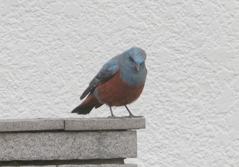 今日の画像は、イソヒヨドリです。今日の帰宅途中の自宅近くで撮影。片側1車線の狭い道の反対側のお宅の塀に止まっていました。撮影直前にその塀の近くを歩行者が通り過ぎたけど、逃げませんでした。私がカメラを向けているのを知っており、こちらに注意を向けていました。少し人に慣れているのかも。