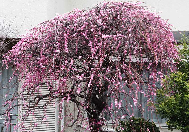 今日の画像は、枝垂れ梅の花です。ご近所の庭の枝垂れ梅が満開です。ほとんどの花弁はピンクですが、白い花びらが少し混ざっており、プチ源平咲きです。