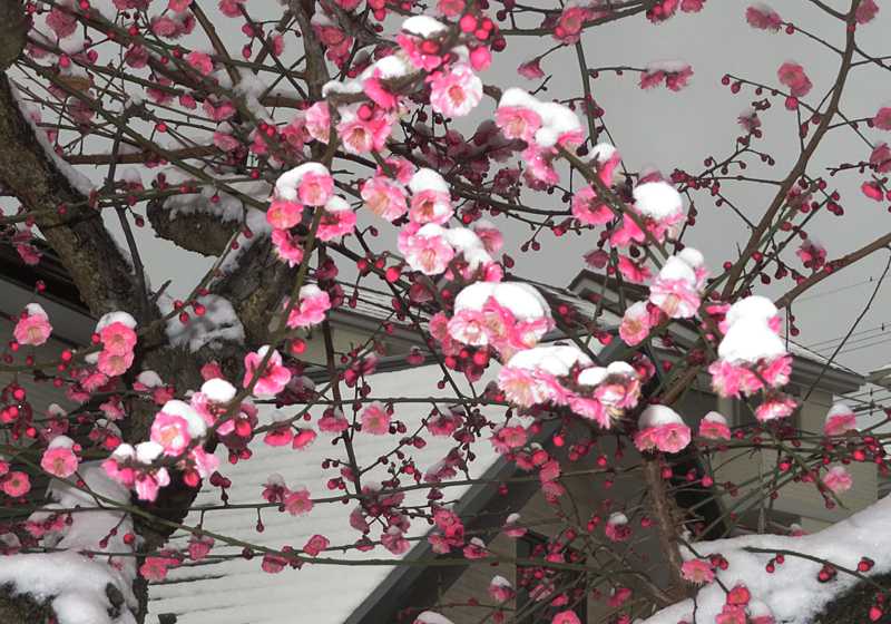 今日の画像は、雪が積もった紅梅です。先日の衆議院選挙の投票会場の近くに植えられている紅梅の花に白い雪が積もっており素敵な景色でした。